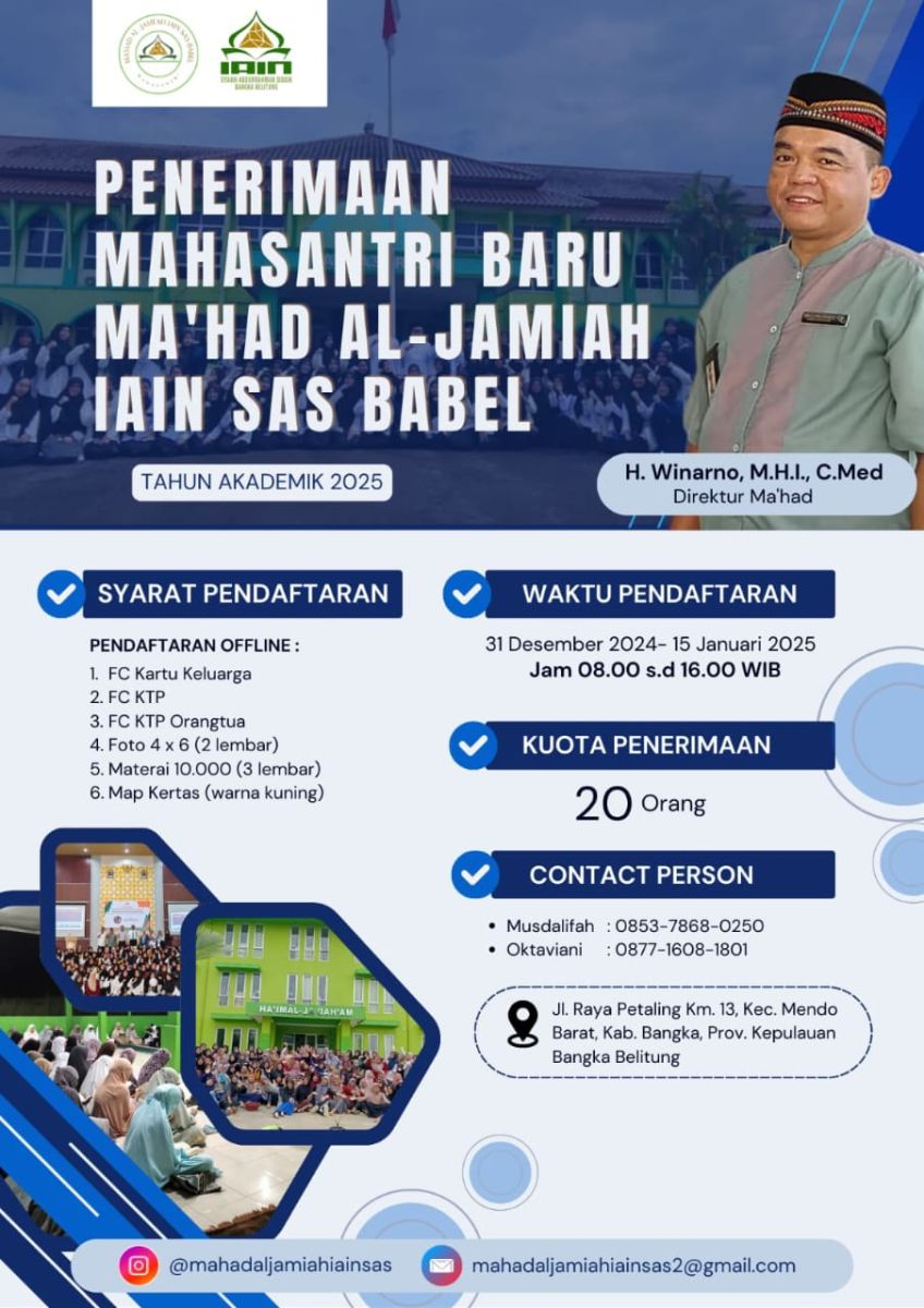 Akhirnya yang kalian tunggu-tunggu telah hadir!! Dibukanya pendaftaran mahasantri baru IAIN Syaikh Abdurrahman Siddik Bangka Belitung Semester Genap Tahun Akademik 2024/2025
